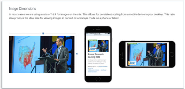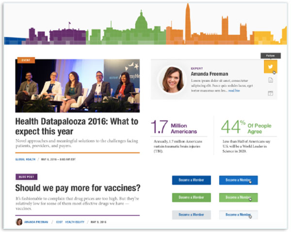 With the goal of increasing membership in mind, I knew it was important to create a feel of belonging with the new design. We used a skyline image for the homepage that represents the different elements of our member base: healthcare practitioners, university researchers, and government policymakers. The prismatic skyline also represents the breadth and scale of the healthcare community.